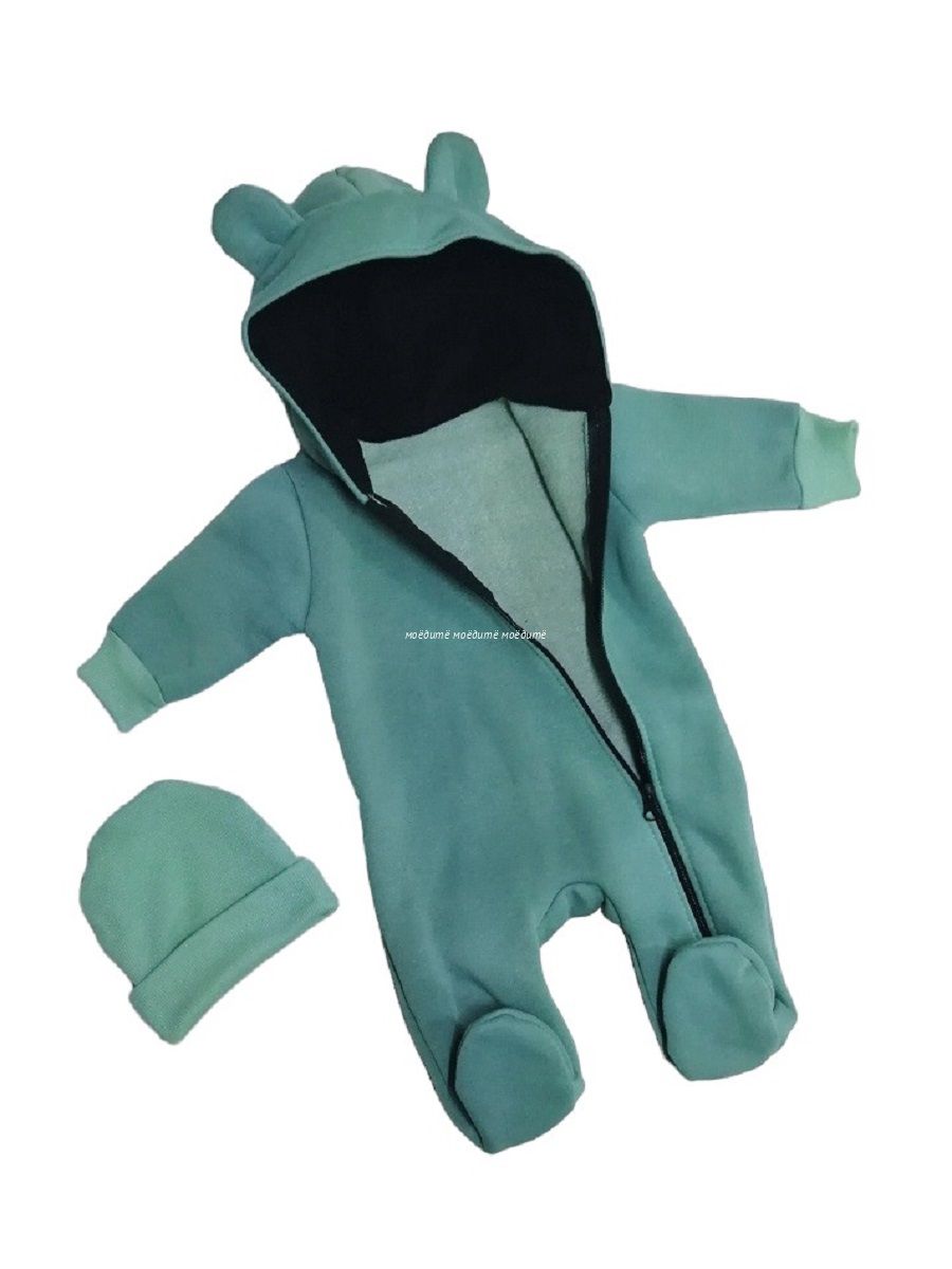 "МоёДитё" комбинезон выполнен из футера с начёсом. Комбинезон с капюшоном на подкладке и декорирован сверху ушками, с закрытыми ножками, рукава на манжетах, спереди косая молния до конца одной ножки. Шапочка из кашкорсе можно одевать как с отворотом, так и без. Очень хорошо тянется.