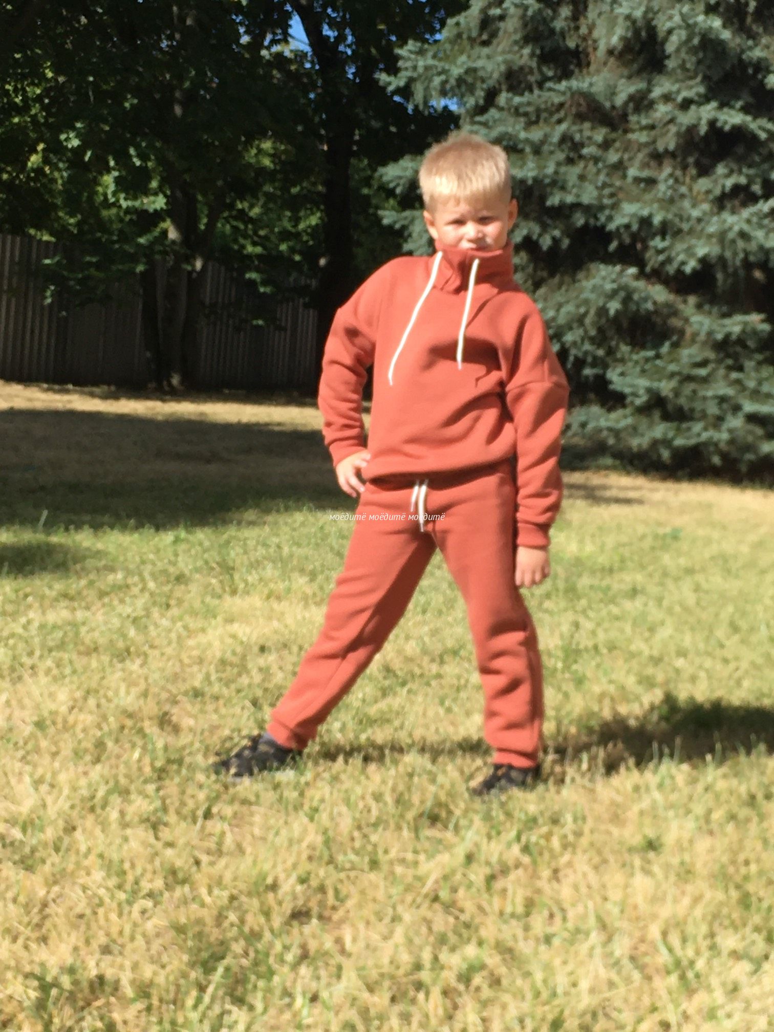 Костюм выполнен из футера 3-хнитки с начёсом. Состоит из свитшота и брюк. Брюки сверху на широкой резинке и со шнурком, снизу на манжете с отворотом. Свитшот с воротником-стойкой, украшен шнурком, снизу вставлена резинка, рукава на манжетах с отворотом.
